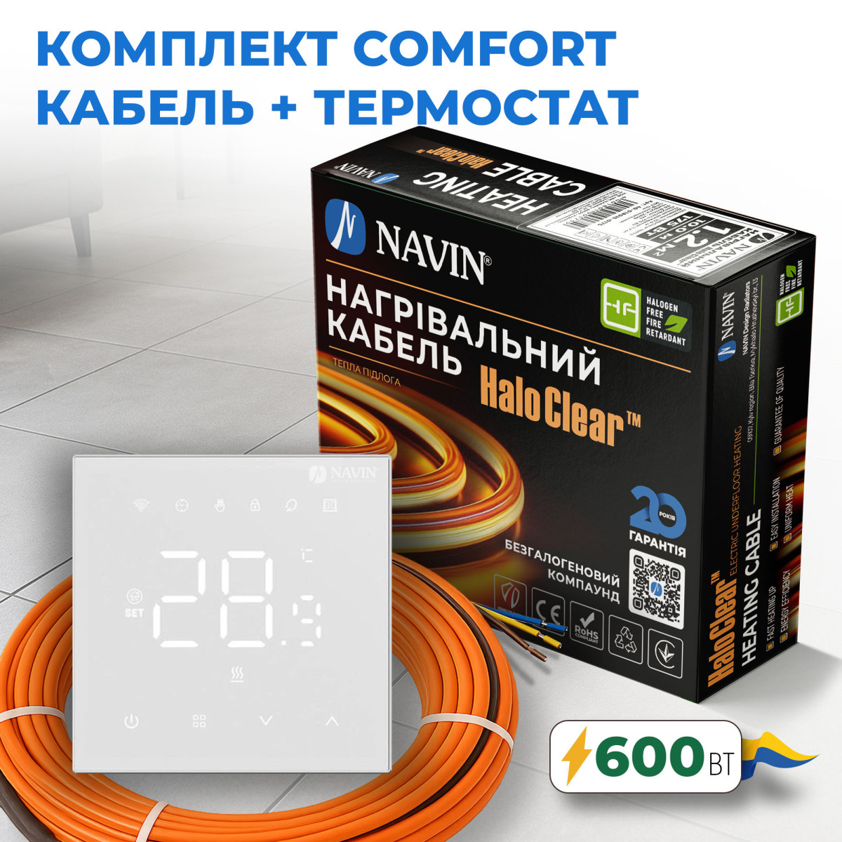 The NAVIN Comfort underfloor heating kit combines the efficient HaloClear™ heating cable and the WT410 W-16A thermostat with Wi-Fi , creating a reliable and safe electric underfloor heating system for any room. It is a ready-made solution for installation under tiles, laminate or linoleum, which provides comfortable soft heat, stable operation and easy one-handle control.
