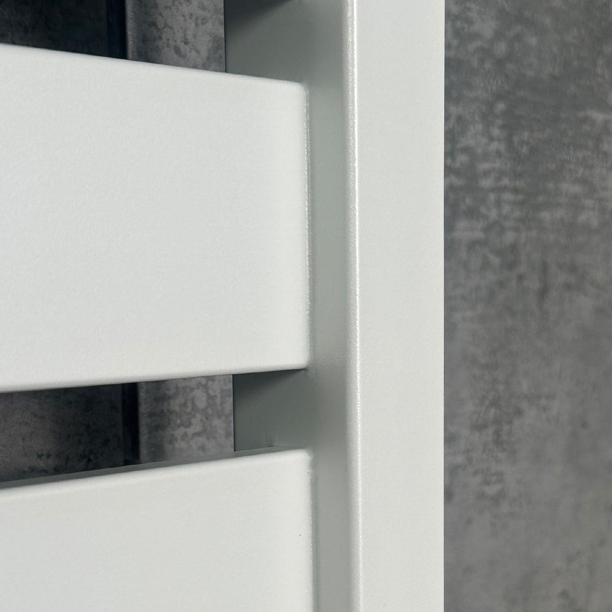 The Largo 1100x500 Sensor towel warmer with Wi-Fi (color — white velvet; location of the cord with a plug — on the right) from the Ukrainian manufacturer NAVIN is made of carbon steel, which is characterized by high quality and durability. The model has a reliable powder coating. The wall thickness of the collectors (racks) and jumpers of the towel dryer is 1.5 mm.