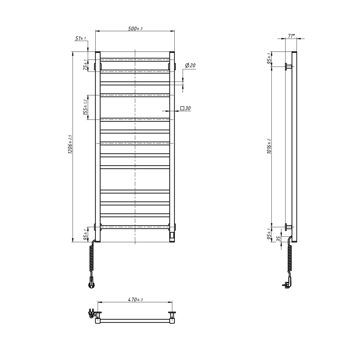 Технічні характеристики електричної рушникосушарки Класик Квадро 500х1200 Sensor з WI-FI (колір — чорний муар; розташування шнура з вилкою — ліворуч) від українського виробника NAVIN виготовлена з вуглецевої сталі, яка відрізняється високою якістю й міцністю. Модель має надійне порошкове покриття. Товщина стінки колекторів (стійок) і перемичок сушарки дорівнює 1,5 мм.