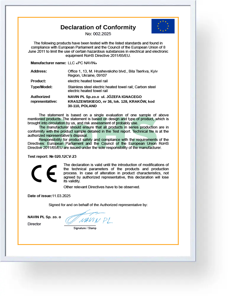 Компания NAVIN - украинский производитель полотенцесушителей европейского качества. Качество наших полотенцесушителей подтверждено соответствующими сертификатами.