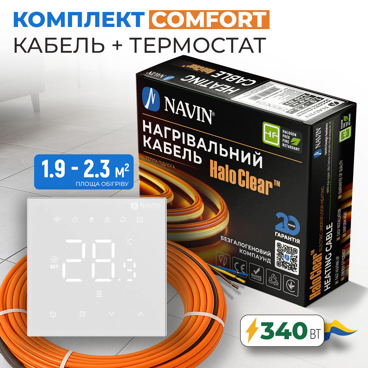 Описание - Комплект теплого пола NAVIN HaloClear Comfort 340 Вт / 1.9 - 2.3 м² (18.9 м) нагревательный кабель + терморегулятор WT410 W-16A с Wi-Fi, белый матовый