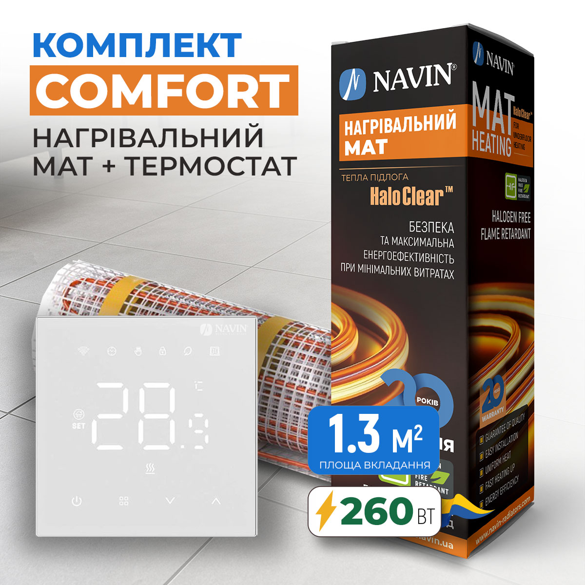 Описание - Комплект теплого пола Comfort - нагревательный мат NAVIN HaloClear 260 Вт / 1.3 м² (2.6 м) + терморегулятор WT410 W-16A с Wi-Fi, белый матовый