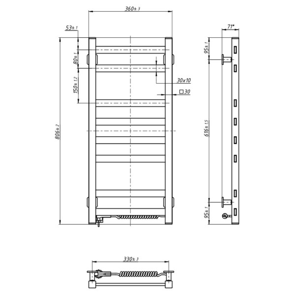 Полотенцесушитель Авангард 360х800 от украинского производителя NAVIN изготовлен из углеродистой стали, которая отличается высоким качеством и прочностью. Модель имеет порошковое покрытие. Толщина стенки перемычек полотенцесушителя составляет 1,5 мм, а стоек 2 мм.