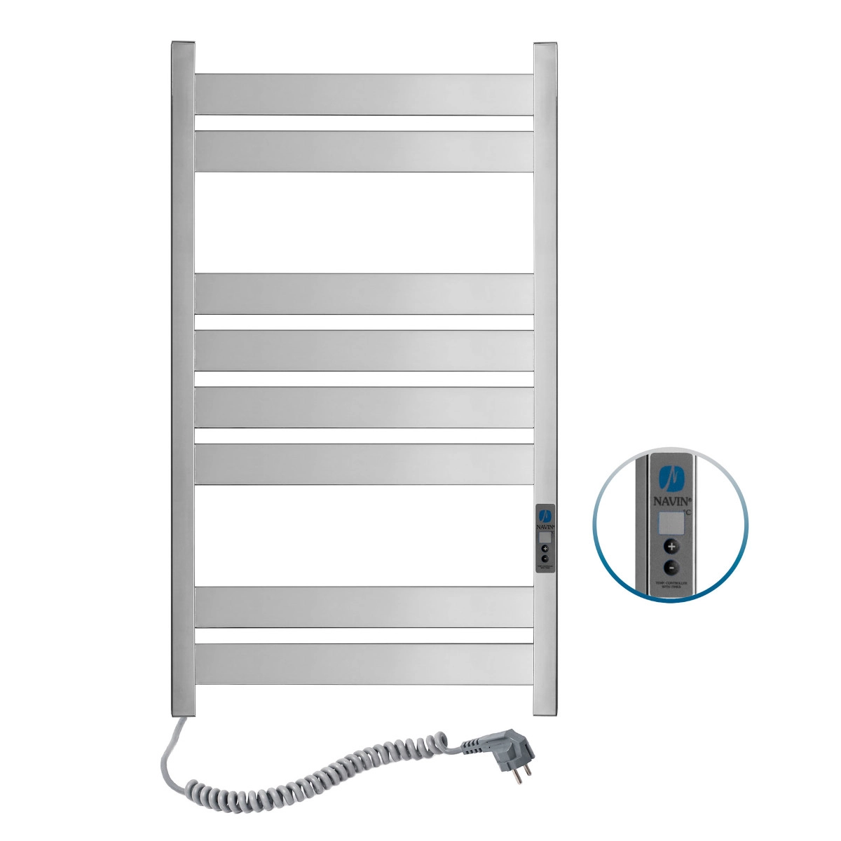 Полотенцесушитель Largo 500х800 Digital с таймером (расположение шнура с вилкой — слева) от украинского производителя NAVIN изготовлен из нержавеющей стали, устойчивой к царапинам и механическим повреждениям, а также обладает высокой антикоррозийной устойчивостью. Толщина стенки перемычек сушилки составляет 1,5 мм, а боковых коллекторов — 2 мм. Полотенцесушитель имеет зеркальную полированную поверхность, полученную путем высокоточной электроплазменной полировки.