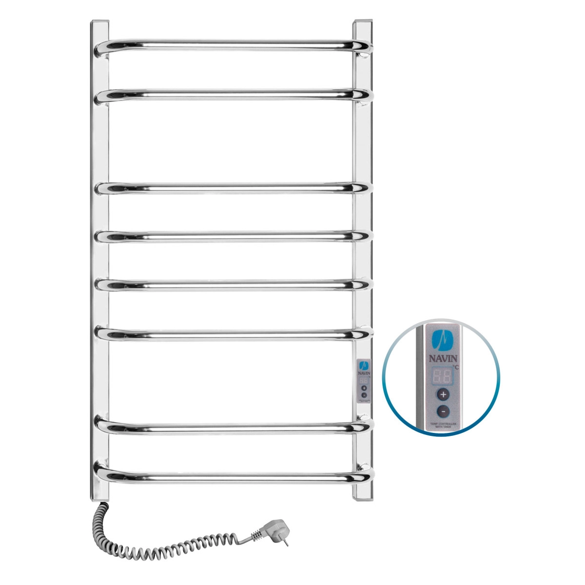 Электрический полотенцесушитель Симфония Квадро 480х800 Digital с таймером, от украинского производителя NAVIN изготовлен из нержавеющей стали, которая является устойчивой к царапинам и механическим повреждениям, а также обладает высокой антикоррозийной устойчивостью. Толщина стенки перемычек полотенцесушителя составляет 1,5 мм, а стоек 2 мм. Полотенцесушитель имеет зеркальную полированную поверхность, полученную путем высокоточной электроплазменной полировки.